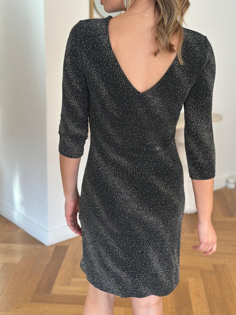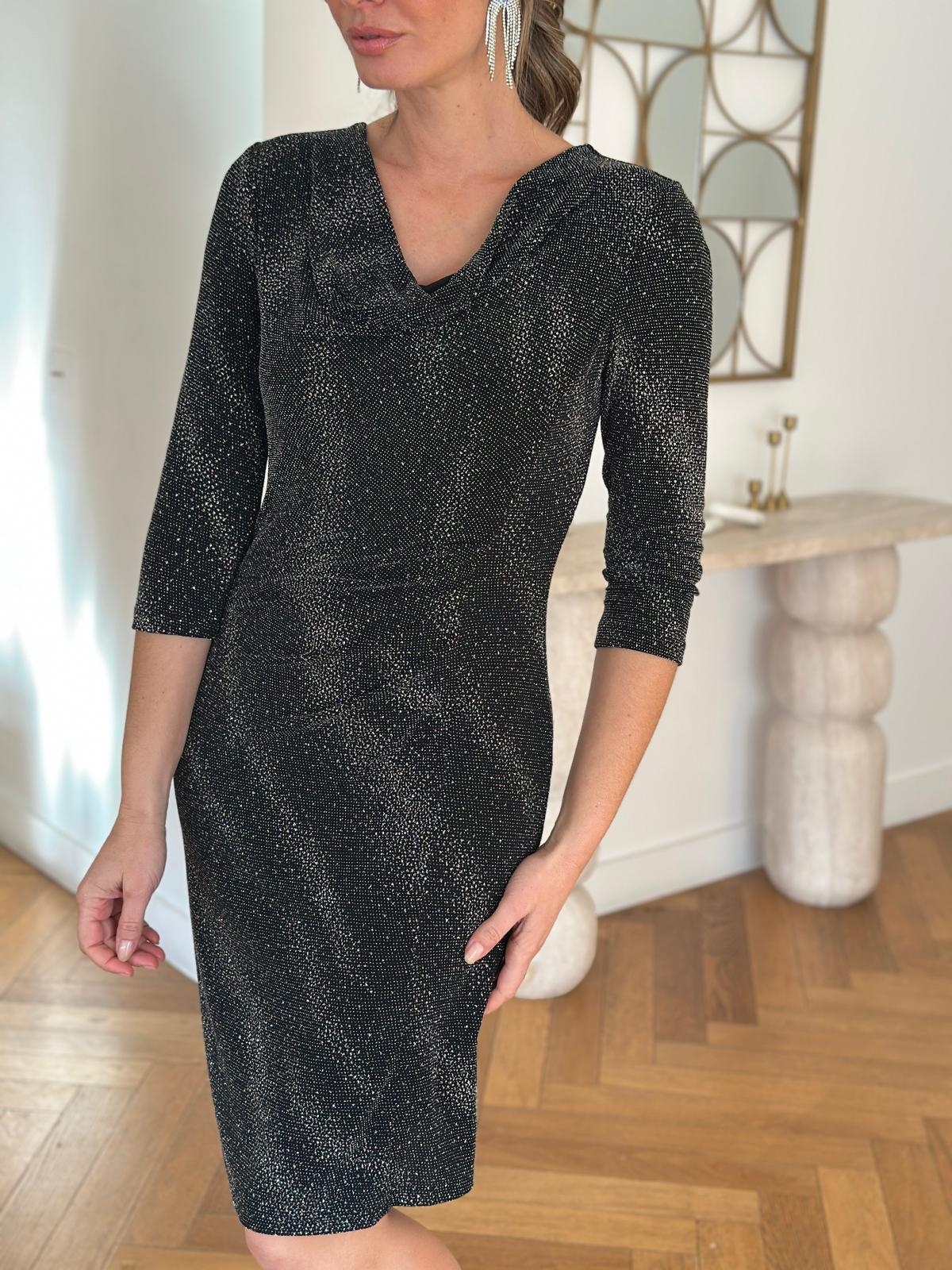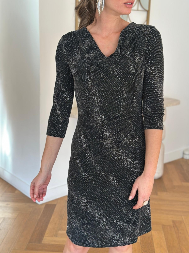 Pour les jours de fête pensez à la robe noire CELESTE qui flattera votre silhouette. Col chic , tissu pailleté longueur au genou, tout a été pensé pour vous conférer une allure élégante et une silhouette élancée.