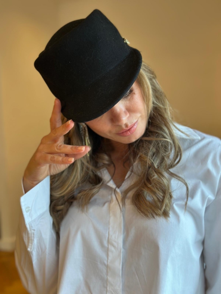 La Casquette Virginie va vite devenir un incontournable de votre vestiaire. Ce chapeau est fabriqué en feutre et de facon artisanale. ! A matcher avec une robe longue et fluide pour un look inoubliable !