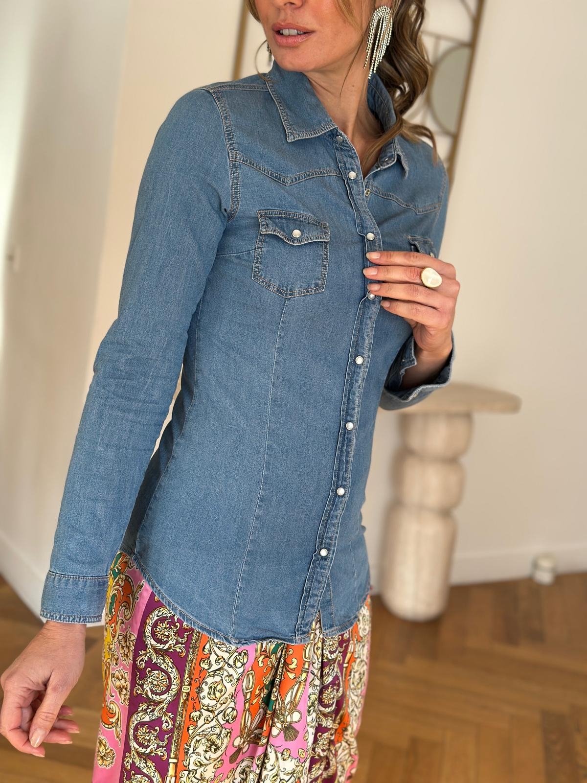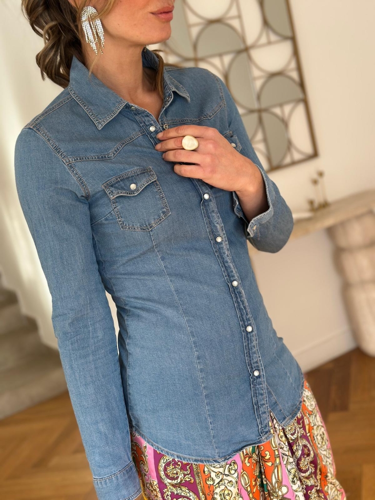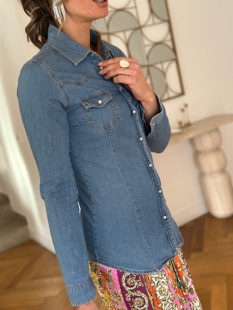 Dans un esprit romantique, la chemise en jean Vicky Maison 144 by So addict est une pièce incontournable de notre garde-robe. Ce modèle manches longues présente un col chemise . Un haut à porter sur un slim avec des escarpins comme sur un jean avec des bottines et un perfecto aussi bien qu'avec une jupe fluide et des nu-pieds ce printemps.