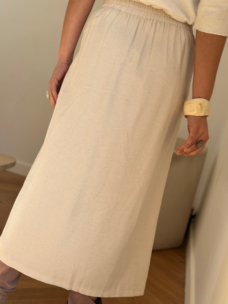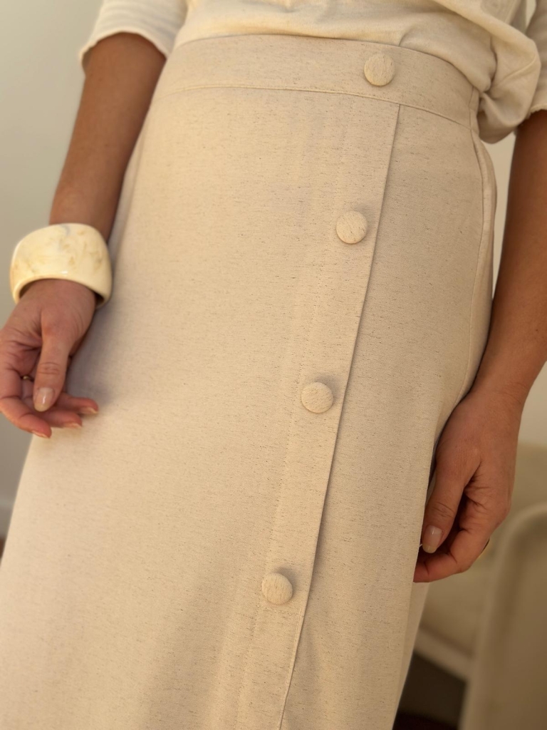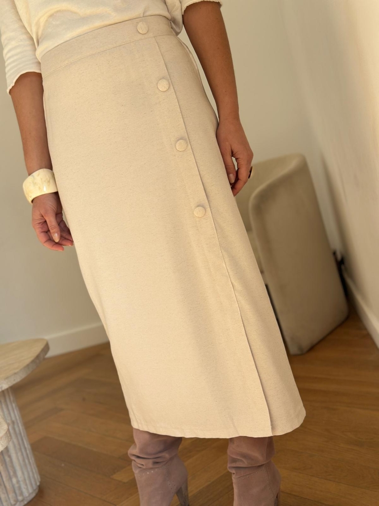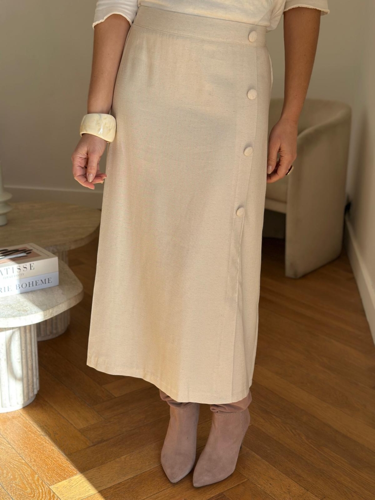 Élégante et féminine , cette jupe midi en tissu blanc cassé apporte une touche chic à toutes vos tenues. Sa coupe droite flatte la silhouette tandis que sa fermeture décorative à boutons sur le devant ajoute une note moderne et raffinée. La taille est partiellement élastiquée à l’arrière, ce qui garantit un maintien confortable et un ajustement optimal. Conçue dans une matière douce et légèrement texturée, elle est idéale pour le quotidien comme pour des occasions plus habillées.