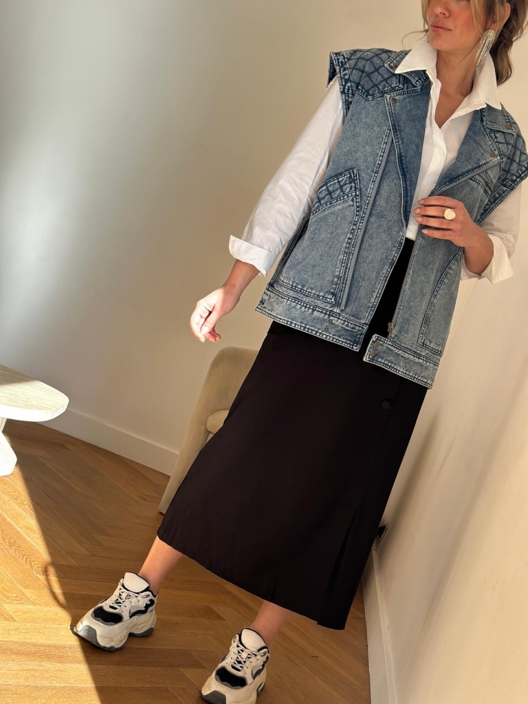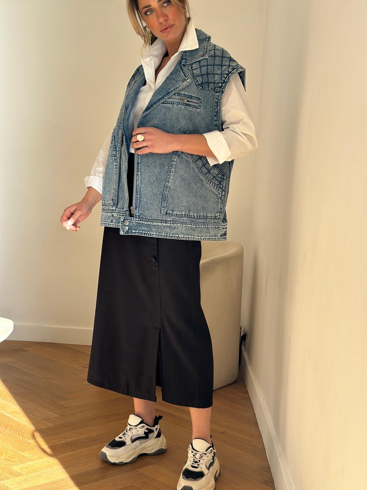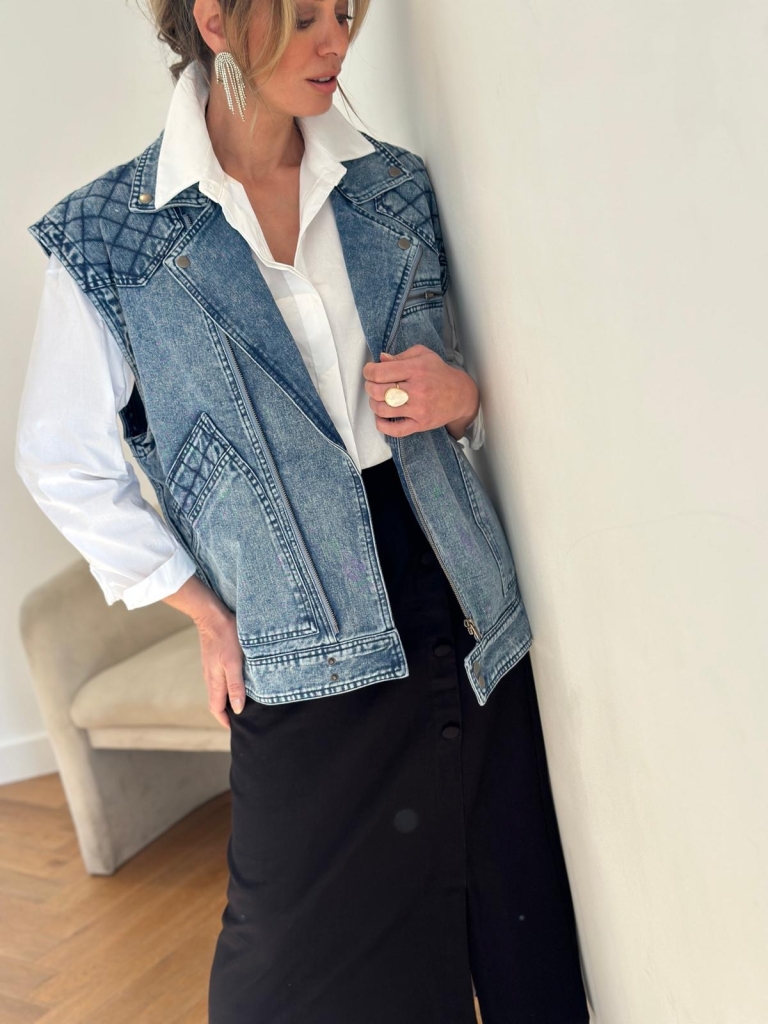 Allure cool et régressive pour la veste sans manches Emy Maison144 by Soaddict . Cette veste en jean sans manches, à la coupe oversize, multiplie les détails soignés : une carrure marquée inspirée des années 80, une coupe droite et des jeux de coutures devant et au dos, qui apportent du relief au vêtement. Une veste en jean originale que vous porterez aussi bien en jean baskets qu'avec un jupe droite et des bottines .